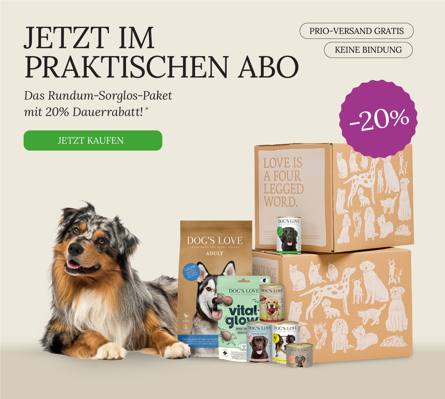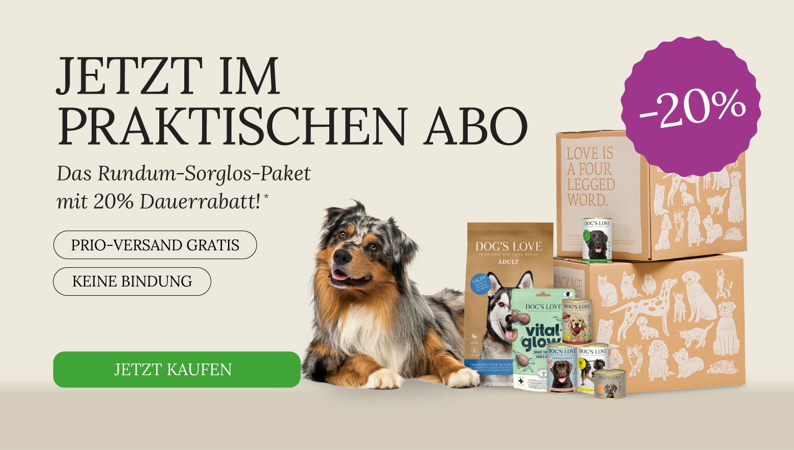 *Aktion gültig im DOG'S LOVE Onlineshop (ausgenommen dogslove.com/it und dogslove.com/es) bis 31.10.2025, 23:59 Uhr. Nicht kombinierbar mit anderen Rabatten oder Aktionen. Neukunden- und Vielbestellerrabatt sowie Abo-Rabatt können während des Aktionszeitraums nicht eingelöst werden. Gültig nur für Endkunden.