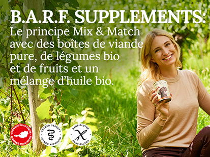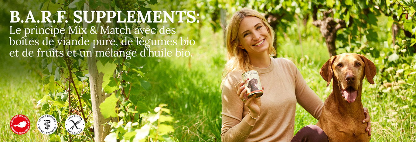 En parfaite alternative au régime BARF, DOG’S LOVE a élaboré trois compléments composés de 91% de pure viande; ainsi qu’un complément Bio-Greens composé exclusivement de fruits et légumes. Ces compléments vous permettent de personnaliser les menus de votre chien et faciliter vos préparations ménagères.