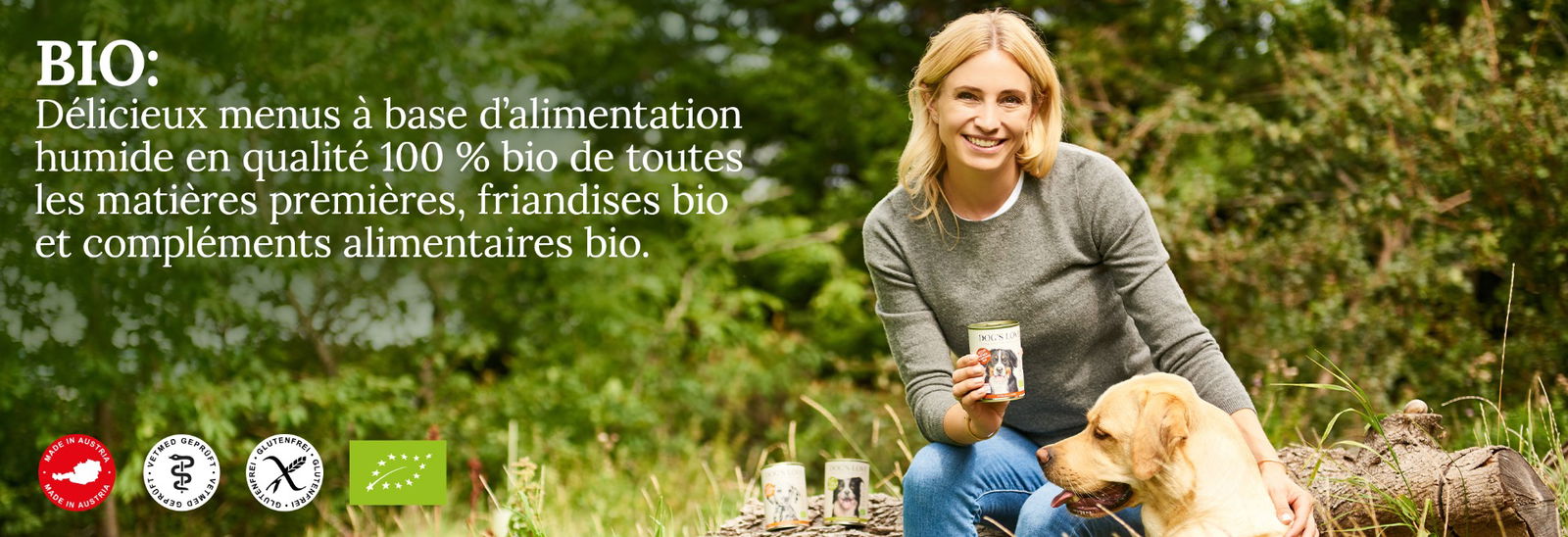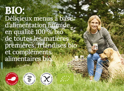 Les trois menus équilibrés de cette gamme sont certifiés 100% BIO. Par engagement responsable, et dans le Respect le plus complet de la nature, tous les ingrédients sélectionnés sont issus de cultures biologiques contrôlées et d’élevages biologiques respectueux des animaux. Le taux de protéines est important: 60% de viande dans chaque menu, toujours sans gluten, ni céréales, pour répondre parfaitement aux besoins alimentaires de votre chien.