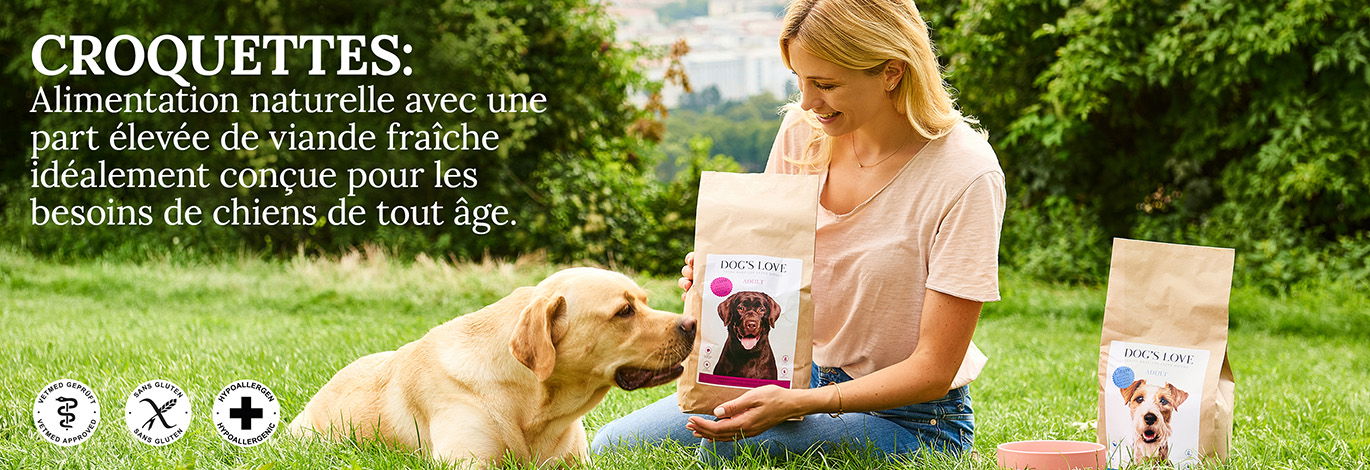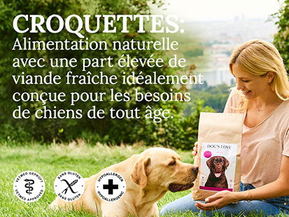 Les croquettes DOG’S LOVE sont 100% naturelles et hypoallergéniques. Elles sont donc parfaitement adaptées aux chiens de tous âges, dès six semaines, même les plus sensibles. Composées de 50% de viande ou de poisson, 35% de fruits et légumes et 10% de vitamines et minéraux, tous les menus sont complets et équilibrés. Sans céréales, toutes les croquettes DOG’S LOVE sont faciles à digérer et assimilée plus rapidement. Grâce à son procédé de fabrication à la pointe de la technologie, les croquettes ne gonflent pas dans l’estomac de votre chien. Leur tube digestif est moins sollicité et le risque de retournement d’estomac diminue de manière significative. L’atout supplémentaire DOG’S LOVE : un atout économique ! Parce qu’elles sont constituées exclusivement d’aliments de premier choix et de 50% de protéines, nos croquettes sont très nutritives. La quantité nécessaire à donner à votre chien est inférieure à celle préconisée traditionnellement.